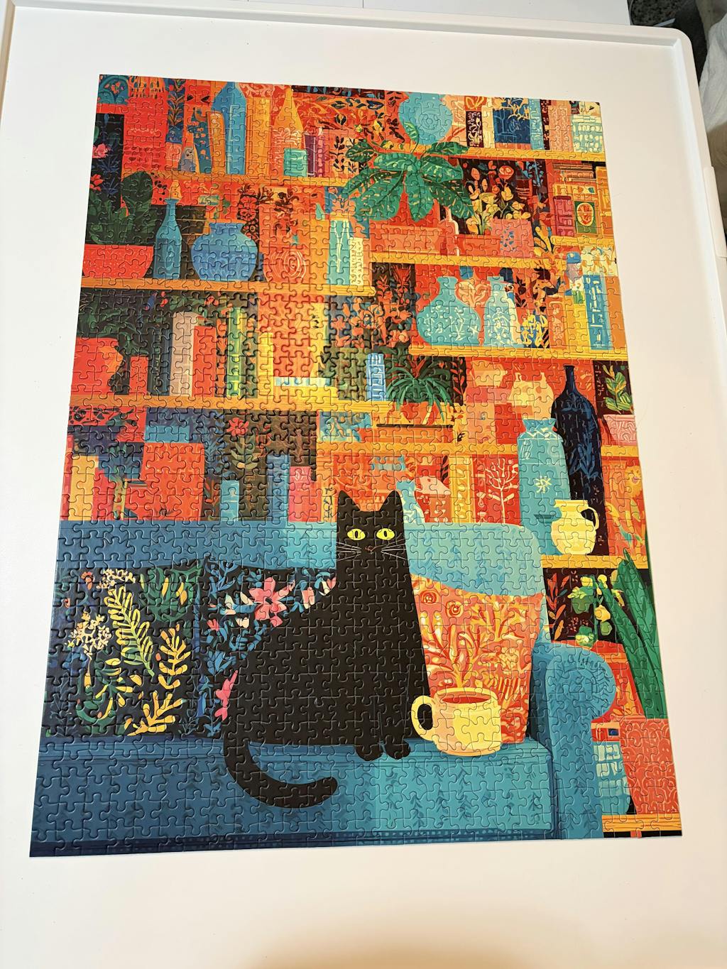 Coffee Cat Library is a 1000-piece jigsaw puzzle for adults that blends playful charm with a richly detailed challenge. Bold reds, teals, and golden yellows fill towering bookshelves lined with patterned spines, vibrant vases, and lush greenery, while a sleek black cat lounges contentedly with a cup of coffee close at paw.