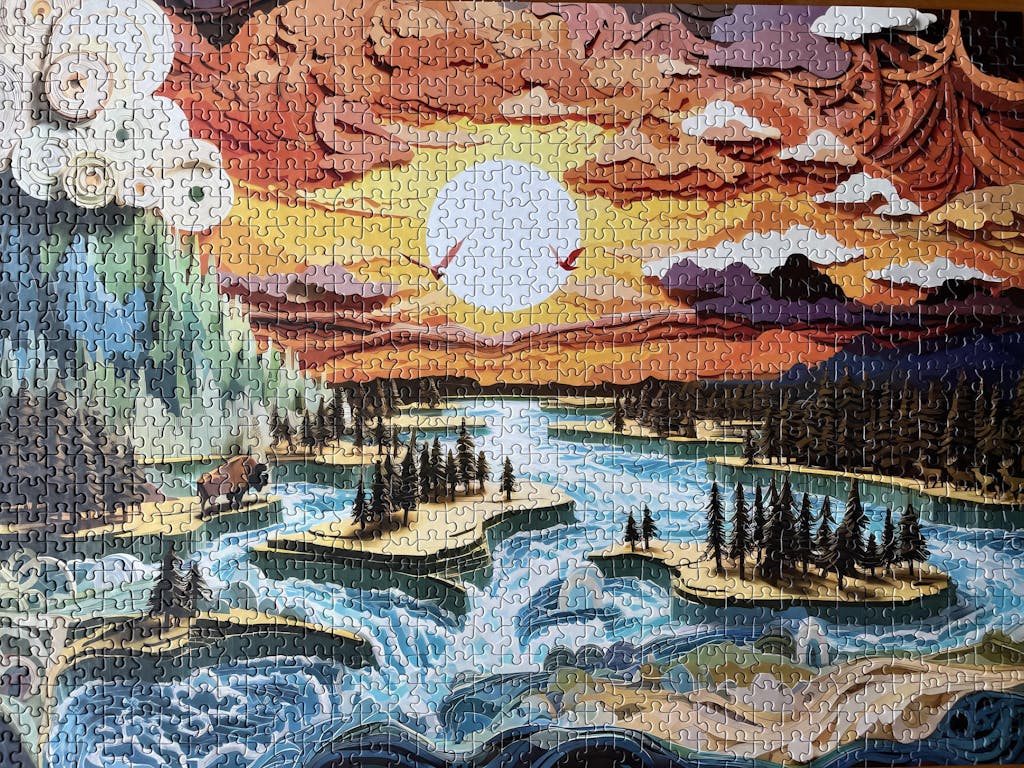 Big Sky Country is a 1000-piece jigsaw puzzle for adults that captures the grandeur of the American West through layered, paper-cut style artistry. Fiery sunset tones of amber, copper, and gold glow above cool blues and teals of rushing water, while forested islands and rolling terrain add depth and movement.