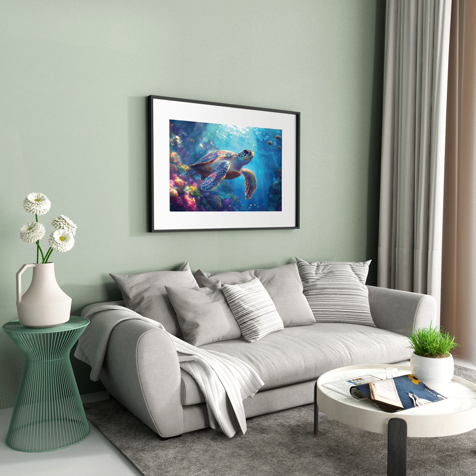 Marvel at the ocean’s beauty as a sea turtle drifts through brilliant reefs, schools of fish, and corridors of light—every piece bursting with color and vitality.
