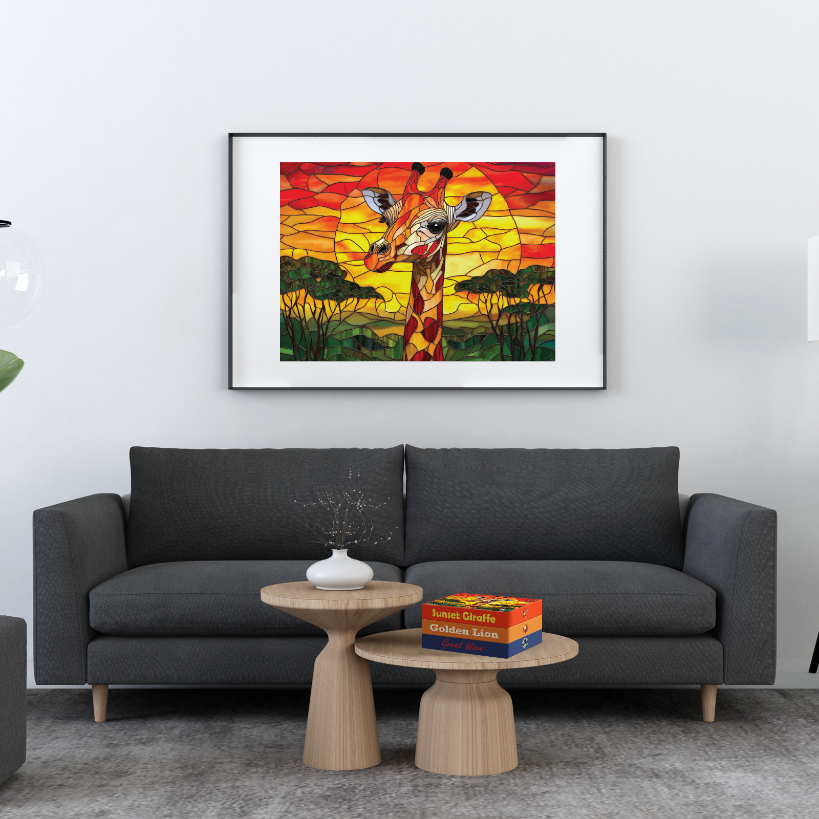 Sunset Giraffe is a 1000-piece jigsaw puzzle for adults that blends the majesty of African wildlife with the brilliance of stained-glass artistry. Radiant hues of orange, red, and gold illuminate the sky while the giraffe’s graceful silhouette emerges.